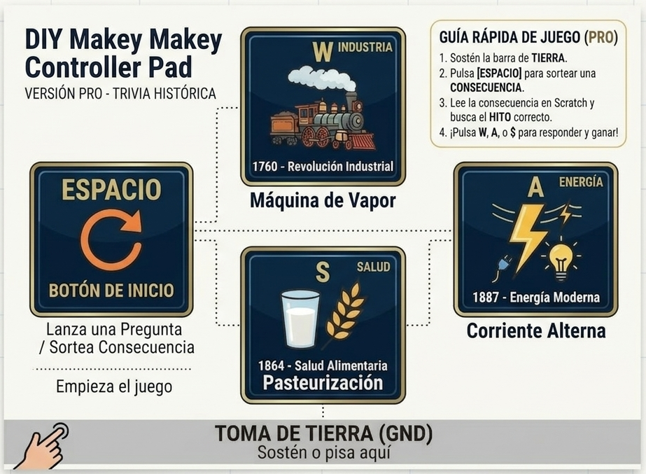 Para ello, se propone diseñar un algoritmo que utilice listas para mostrar consecuencias al azar sobre un mapa histórico. Es vital que el docente facilite la comprensión de cómo la tecnología Makey-Makey permite que materiales como el carbón o el metal actúen como interruptores lógicos. La correcta ejecución de este sistema garantiza que nuestra división presente pruebas dinámicas e irrefutables ante el Consejo del Tiempo.