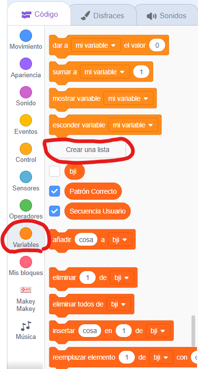 - Definición de nuevas variables. Accede a la categoría Variables (color naranja) situada en el menú lateral de bloques y pulsa el botón "Crear una variable" que aparece en la parte superior del panel.