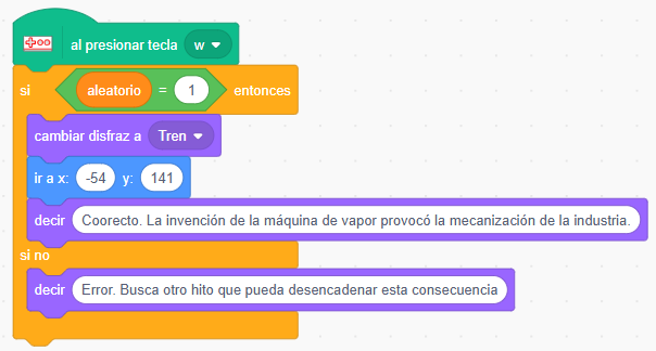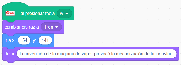 - Hito de la Revolución Industrial. Al detectar la pulsación de la tecla w, el código desglosa el cambio visual al disfraz "Tren" y posiciona al objeto en la parte superior izquierda (x: -54 y: 141). Acto seguido, el programa narra el mensaje: "La invención de la máquina de vapor provocó la mecanización de la industria.".