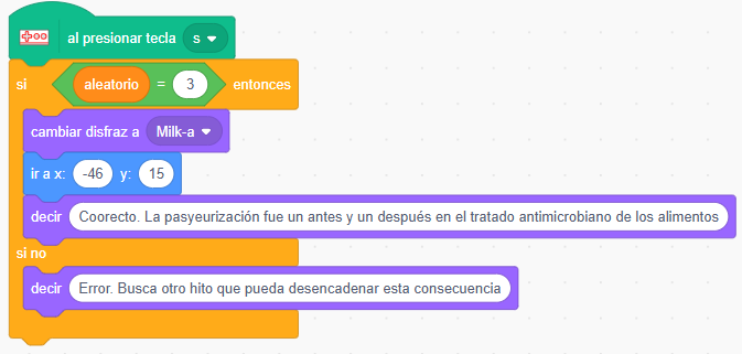 - Respuesta para la salud (S). Si se presiona S y aleatorio es igual a 3, el disfraz cambia a Milk-a y el programa narra la información sobre la pasteurización y el tratado antimicrobiano; en caso de fallo, se activa el bloque de error correspondiente.