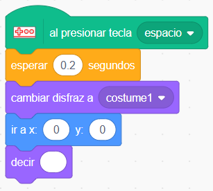 - Reinicio del sistema: Al presionar la tecla espacio, el programa ejecuta una limpieza lógica; tras una espera de 0.2 segundos, el objeto vuelve a su costume1, se sitúa en el centro (x: 0 y: 0) y el sistema ejecuta un bloque para limpiar cualquier mensaje previo en pantalla.