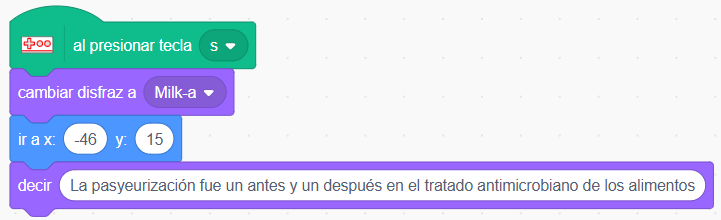 - Pista de investigación. Programamos la tecla s para que el objeto adopte el disfraz Milk-a y se desplace a las coordenadas x: -48, y: 15. Redactamos el mensaje sobre el tratado antimicrobiano de los alimentos.
