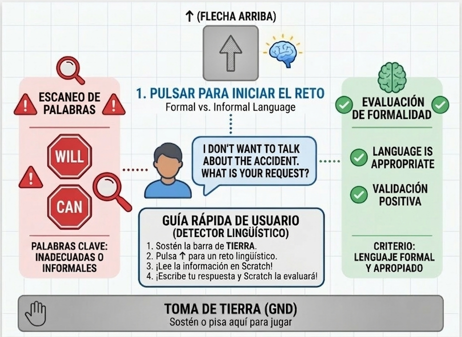 El objetivo principal es que el alumnado de Inglés programe un sistema de análisis lingüístico mediante la validación de estructuras en Scratch y la placa Makey Makey. Se busca que el estudiante transite del uso informal al análisis técnico del lenguaje. Estableciendo las bases de la comunicación internacional en el tribunal.