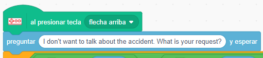 - Interacción y estructura condicional (Tecla Flecha Arriba). Al activar el evento de la flecha arriba, el programa desglosa una serie de preguntas para evaluar al usuario. Primero narra la pregunta: "I don't want to talk about the accident. What is your request?" y espera la entrada de texto.
