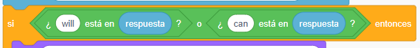 - Análisis condicional de la respuesta. El sistema desglosa la entrada de texto utilizando un bloque de operadores lógicos de tipo "o" para buscar palabras específicas dentro de la variable interna respuesta. El código evalúa si la palabra "will" está presente o si la palabra "can" está presente.