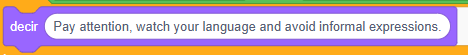 - Si se detecta cualquiera de las dos palabras informales, el programa narra el mensaje de advertencia: "Pay attention, watch your language and avoid informal expressions.".