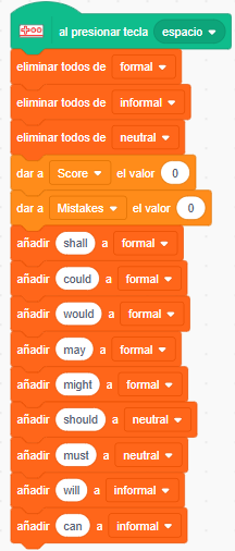 - Reinicio y carga de datos (Tecla Espacio). Al presionar la tecla espacio, el programa limpia cualquier dato previo ejecutando "eliminar todos de" para las tres listas y resetea el progreso ejecutando dar a Score y Mistakes el valor 0. Acto seguido, el sistema llena las listas automáticamente añadiendo verbos modales como "shall", "could" y "would" a la lista formal, "should" y "must" a la neutral, y "will" o "can" a la informal.