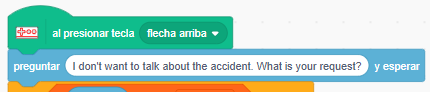 - Activación y pregunta inicial. El flujo de trabajo comienza con el evento "al presionar tecla flecha arriba"; en ese instante, el programa narra una pregunta en pantalla: "I don't want to talk about the accident. What is your request?" y detiene la ejecución hasta que el usuario escribe una entrada.