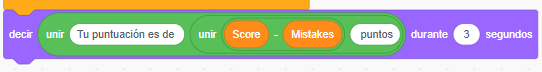 - Pista de investigación. Usamos el bloque decir junto con el operador unir. Debemos calcular la operación Score menos Mistakes para anunciar el veredicto final en pantalla.