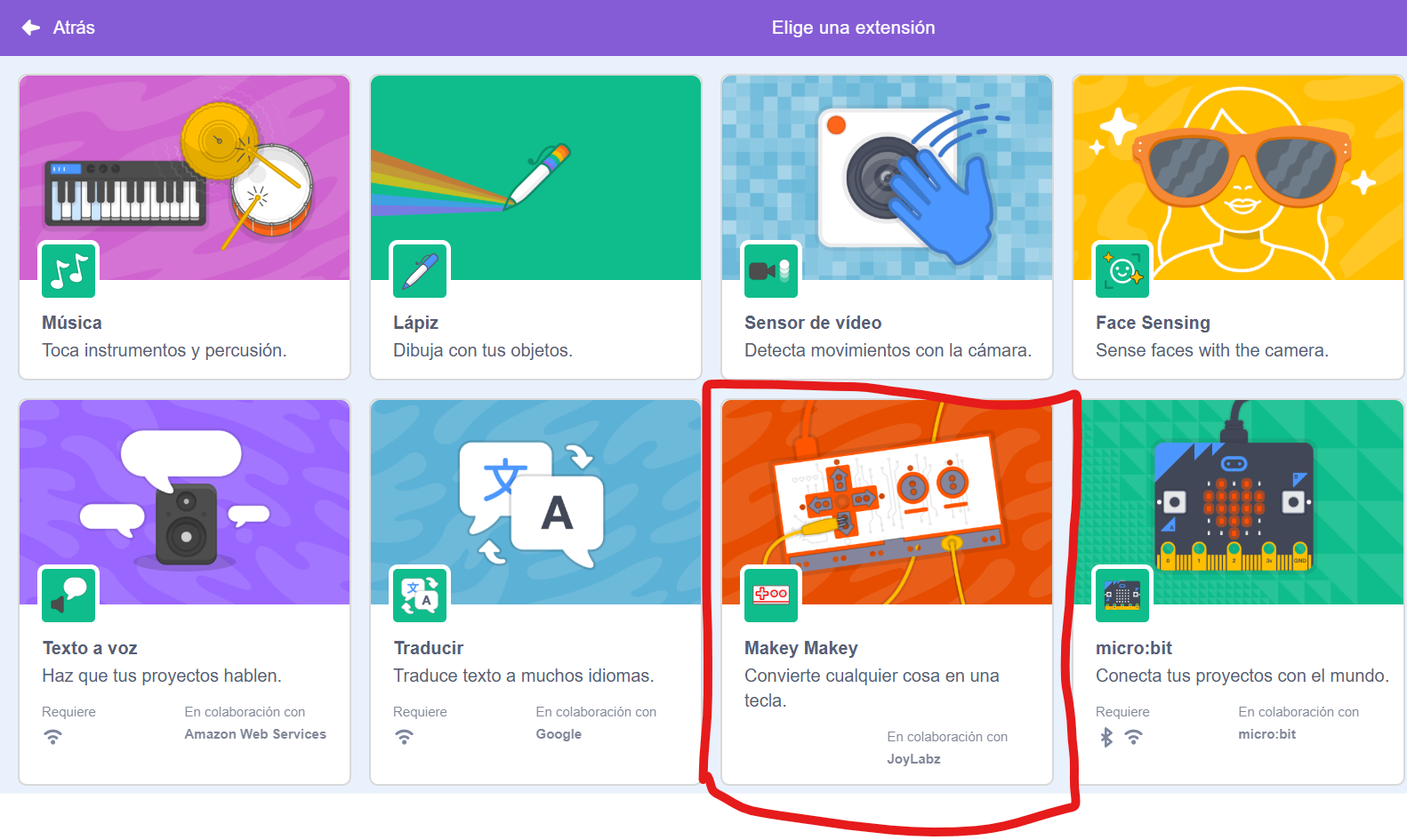 - Añadir las extensiones necesarias (haciendo doble clic): Para este proyecto, se requiere añadir Makey Makey para detectar pulsaciones desde la placa física, lo que activará la simulación del metabolismo.