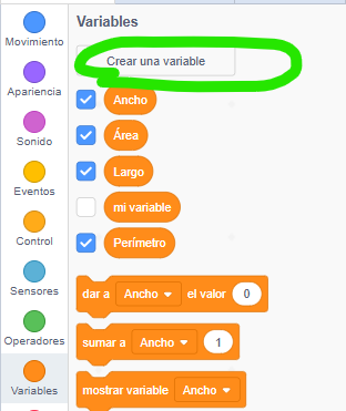 - Definición de nuevas variables. Accede a la categoría Variables (color naranja) situada en el menú lateral de bloques y pulsa el botón "Crear una variable" que aparece en la parte superior del panel.