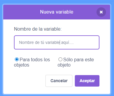 - Para todos los objetos: Selecciona esta opción si quieres que la variable sea global. Esto significa que cualquier objeto (personaje) o el fondo del proyecto puede leer y cambiar su valor. Es la opción ideal para datos compartidos como puntuaciones o dimensiones de una figura.