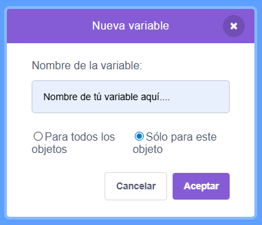 - Sólo para este objeto. Elige esta opción para crear una variable local o privada. Solo el objeto donde la creas podrá acceder a ella. Es muy útil cuando tienes muchos clones o personajes iguales y quieres que cada uno guarde su propia información independiente, como su energía o posición individual.
