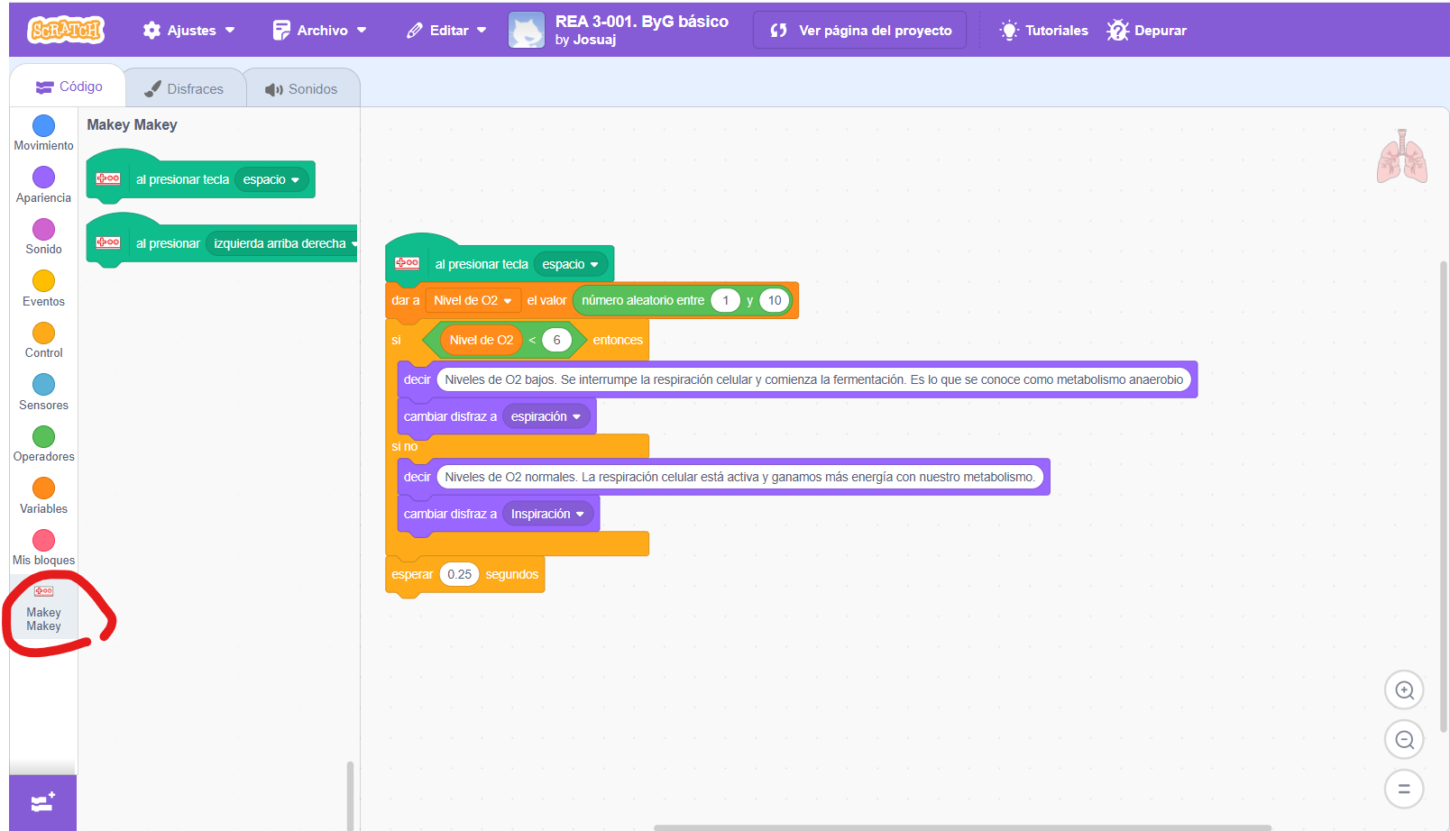 En esta fase inicial configuramos las herramientas necesarias para que el proyecto pueda interactuar con elementos físicos externos mediante Makey Makey y simular procesos biológicos utilizando bloques de control y apariencia.