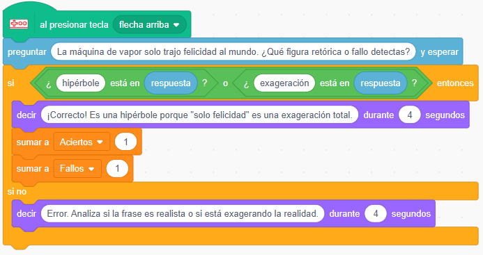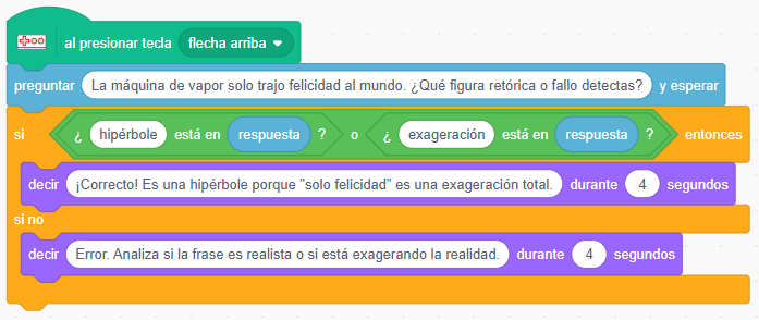 - Evaluación de la Hipérbole (Flecha Arriba). Al presionar la "flecha arriba", el sistema lanza la pregunta sobre si la máquina de vapor solo trajo felicidad y espera la respuesta del usuario. El código valida mediante una estructura condicional que comprueba si "hipérbole" o "exageración" están en la respuesta; de ser así, el programa narra el mensaje: "¡Correcto! Es una hipérbole..." y suma un punto a ambas variables (Aciertos y Fallos). En caso contrario, el sistema narra el mensaje de error sugiriendo analizar si la frase es realista.