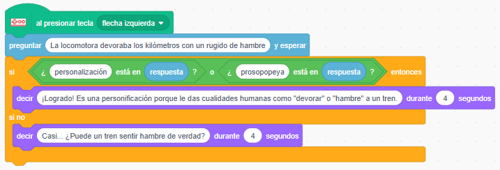 - Pista de investigación. Programamos el bloque al presionar tecla flecha izquierda. Utilizamos el bloque de preguntar para narrar el fragmento: "La locomotora devoraba los kilómetros con un rugido de hambre" y solicitamos identificar la figura presente.