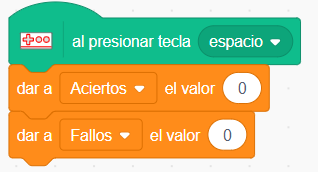 - Puesta a cero. Al detectar el evento de Makey Makey "al presionar tecla espacio", el programa limpia los datos ejecutando los bloques dar a Aciertos el valor 0 y dar a Fallos el valor 0, garantizando que no se arrastren puntos de partidas anteriores.