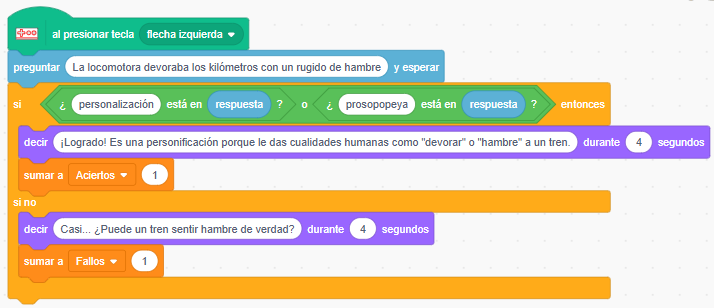 - Evaluación de la Personificación (Flecha Izquierda). El código plantea la frase de la locomotora "devorando" kilómetros y verifica si el usuario responde "personalización" o "prosopopeya". Si se cumple la condición, el sistema narra la confirmación del acierto y aumenta la variable Aciertos; si no, narra una pista y aumenta la variable Fallos.