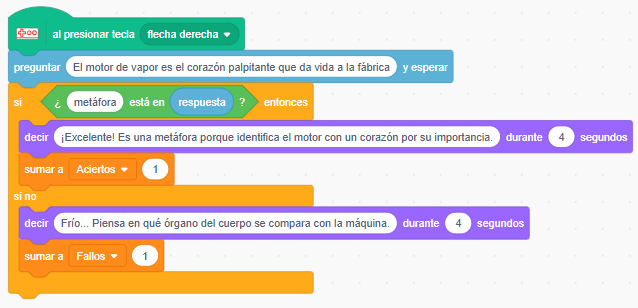 - Pista de investigación. Al activar la flecha abajo, el programa lanza el reto. Si la respuesta contiene el término técnico, el bloque decir explica el valor del trabajo en equipo y suma 1 a Aciertos. En caso de fallo, suma 1 a Fallos.